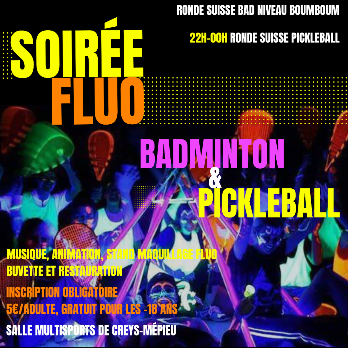 Soirée fluo badminton et pickleball organisée par les Volants Creypieulans.